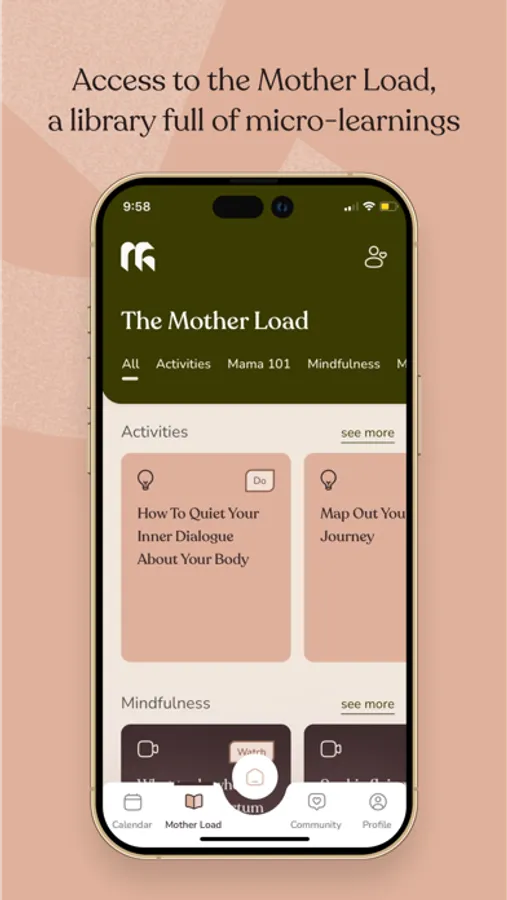 CONTENT: An exclusive content library focused on the parenthood journey and mental health, created by Mavida specialists. The Mavida Mother Load includes written content, video and audio segments, written activities and guided meditations that help build resilience and coping skills.