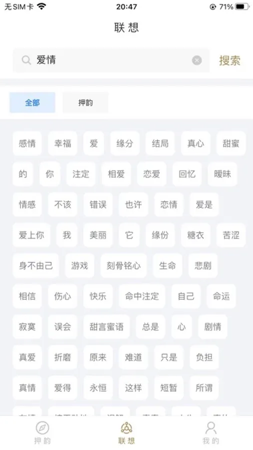 韵律RAP提供中英文押韵、联想、古风押韵等多种功能,是一款易于使用而且功能强大的工具,可以帮助您快速地查找和积累押韵词。无论您是在写诗歌、歌曲、说唱音乐,或者是需要用押韵词来制作广告口号、宣传文案、freestyle等,我们的押韵软件都可以为您提供方便和支持。而创造性的古风押韵,则为更深一步实现中文诗歌的创作添上浓郁的韵味。