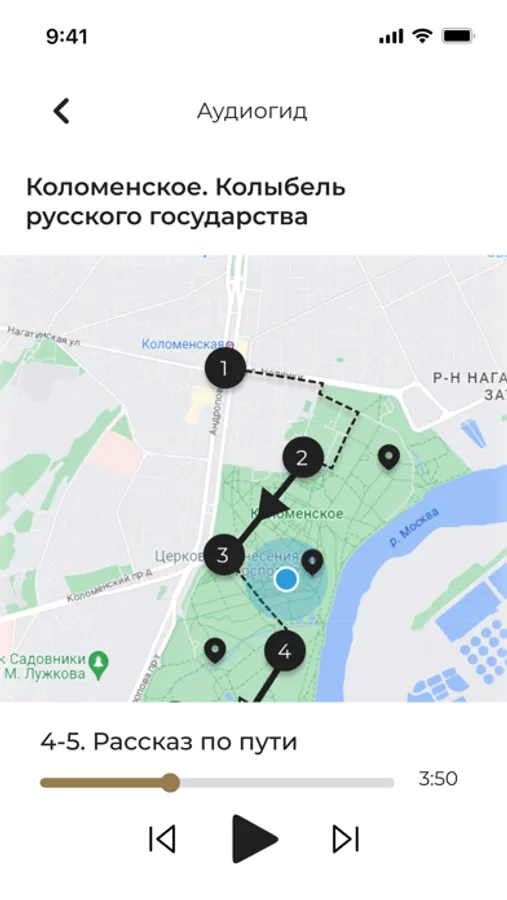 • Помимо основных точек маршрута, есть опция «рассказ по пути», таким образом Вы можете не только переходить от точки к точке, но и узнавать что-то новое по дороге