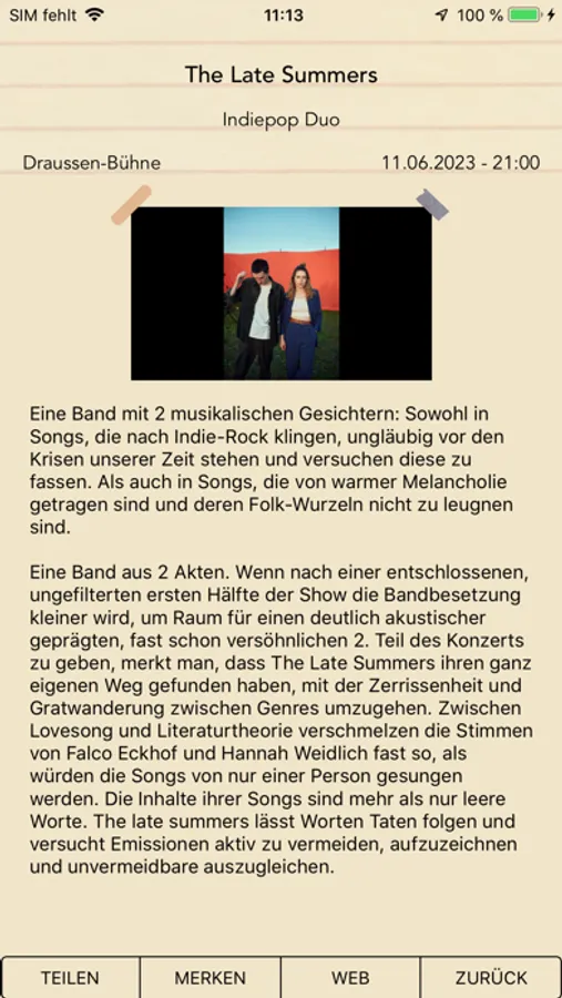 Neben einer klaren Programmübersicht, geordnet nach Tagen und Bühnen, hat man die Möglichkeit, seine Highlights einfach in einen Merkzettel einzutragen oder per Mail an Freunde zu schicken oder in anderen sozialen Medien zu teilen. Links zu den Band-Websites stellen auch noch weitergehende Informationen zur Verfügung.