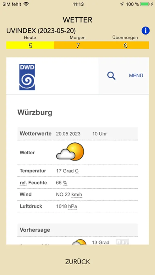 Wettervorhersage und UV-Index für 3 Tage.