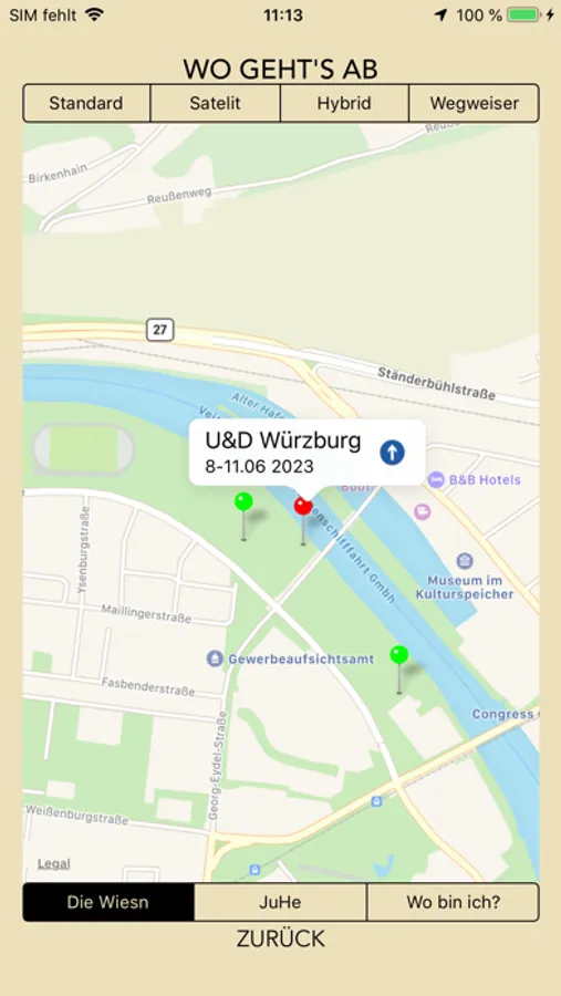 Außerdem beinhaltet die App eine Karte mit Markierungen der wichtigsten Orte und einer eigenen Positionsortung – damit findet jeder zu den Mainwiesen oder zurück zum Bahnhof ...