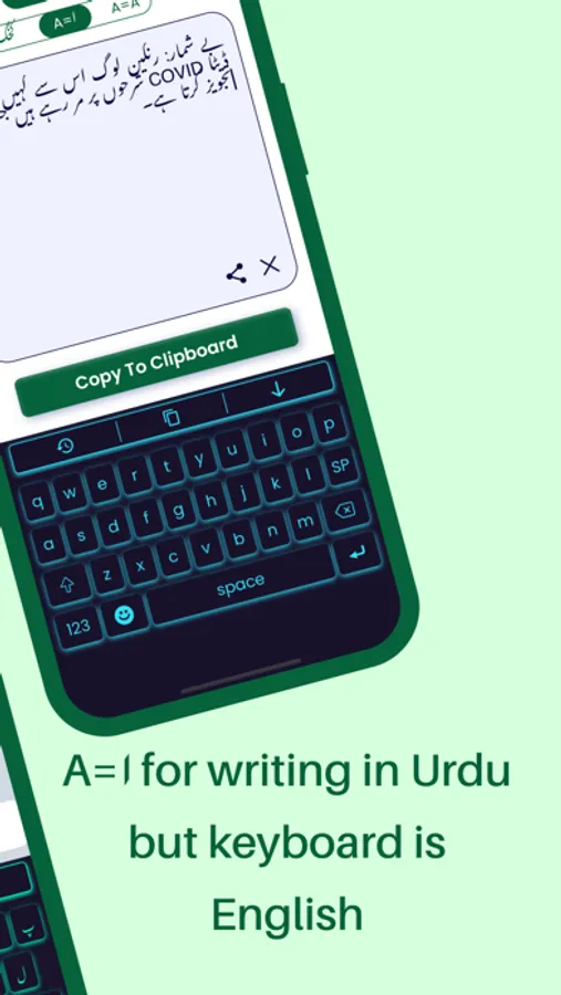 Easy and fast Urdu typing is the first priority of this Urdu Keyboard. Besides direct Urdu typing pad, it also supports phonetic avro style typing. This keyboard helps you typing Urdu very fast with Urdu letters with A = Urdu latter .