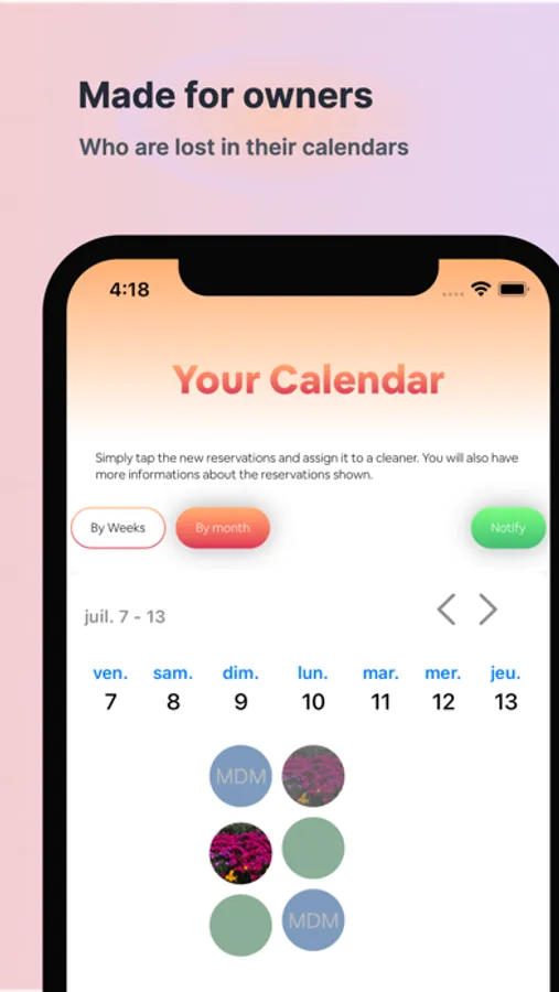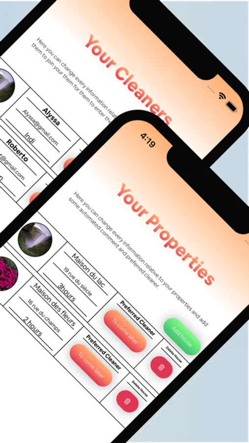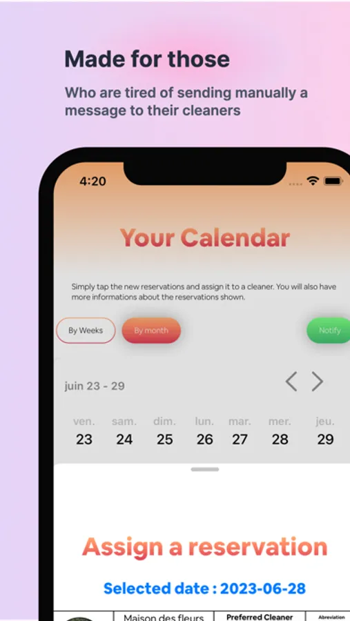 Beclean is an app that allow the users to easily manage your airbnb reservations. By simply adding your cleaners and property, you can assign each reservations to a cleaner. The cleaner will then recieve a message to inform it about the reservations details.