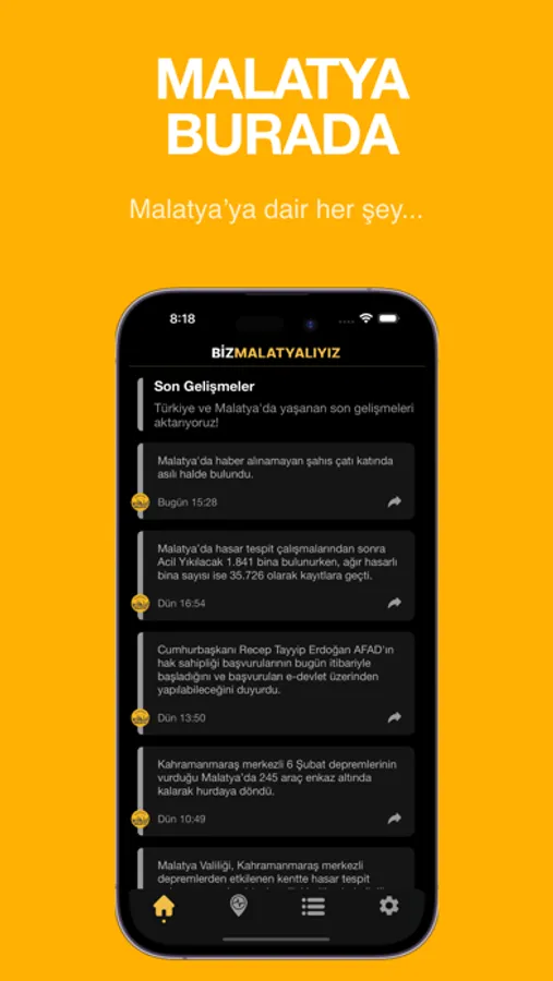 Biz Malatyalıyız uygulaması ile şehrin nabzını tutmak artık parmaklarınızın ucunda! Malatya'yı daha iyi tanımak, güncel bilgilere anında ulaşmak ve hayatınızı kolaylaştırmak için hemen indirin!