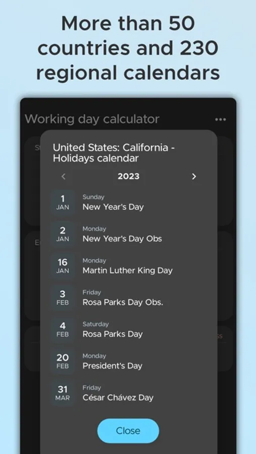 Are you looking for a reliable business day calculator? Look no further than our app! Our mobile application is the perfect tool for anyone who needs to accurately calculate the number of working or weekend days in any given date range. With more than 230 regional calendars from over 50 countries, our app will help you stay on top of all regional holidays and save reminders for any date range.