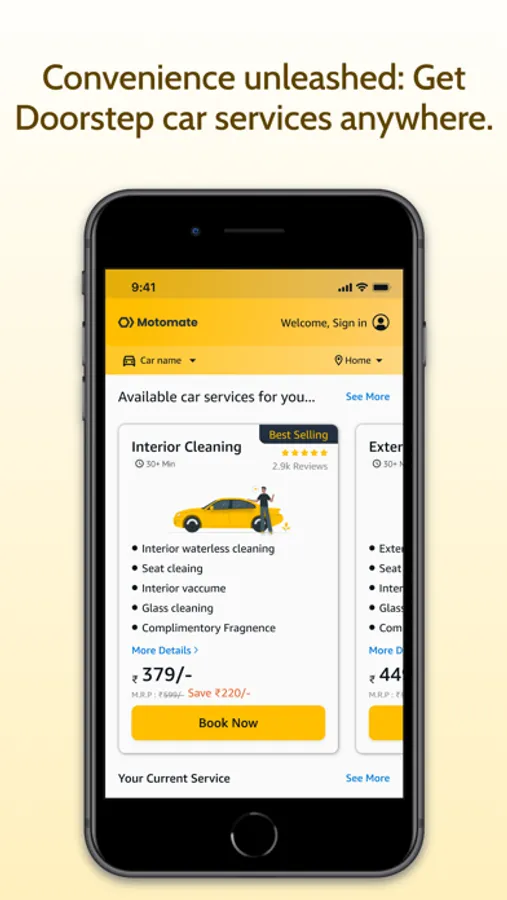 Motomate allows users to book various car services through its mobile app or website. Users can choose from a range of services, such as waterless exterior car cleaning, interior car cleaning, external wax, interior polish, and more. Users can also select the time and location of their preference for the service.
