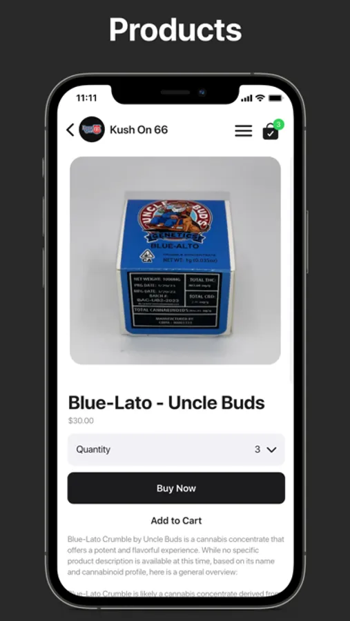With our app, you’ll have the power to explore an extensive selection of top-quality flowers, edibles, concentrates, and more – right at your fingertips. Whether you're a fan of the classic strains such as Blue Dream and Sour Diesel or you're intrigued by newer varieties like Gelato and Wedding Cake, our vast inventory won't disappoint.
