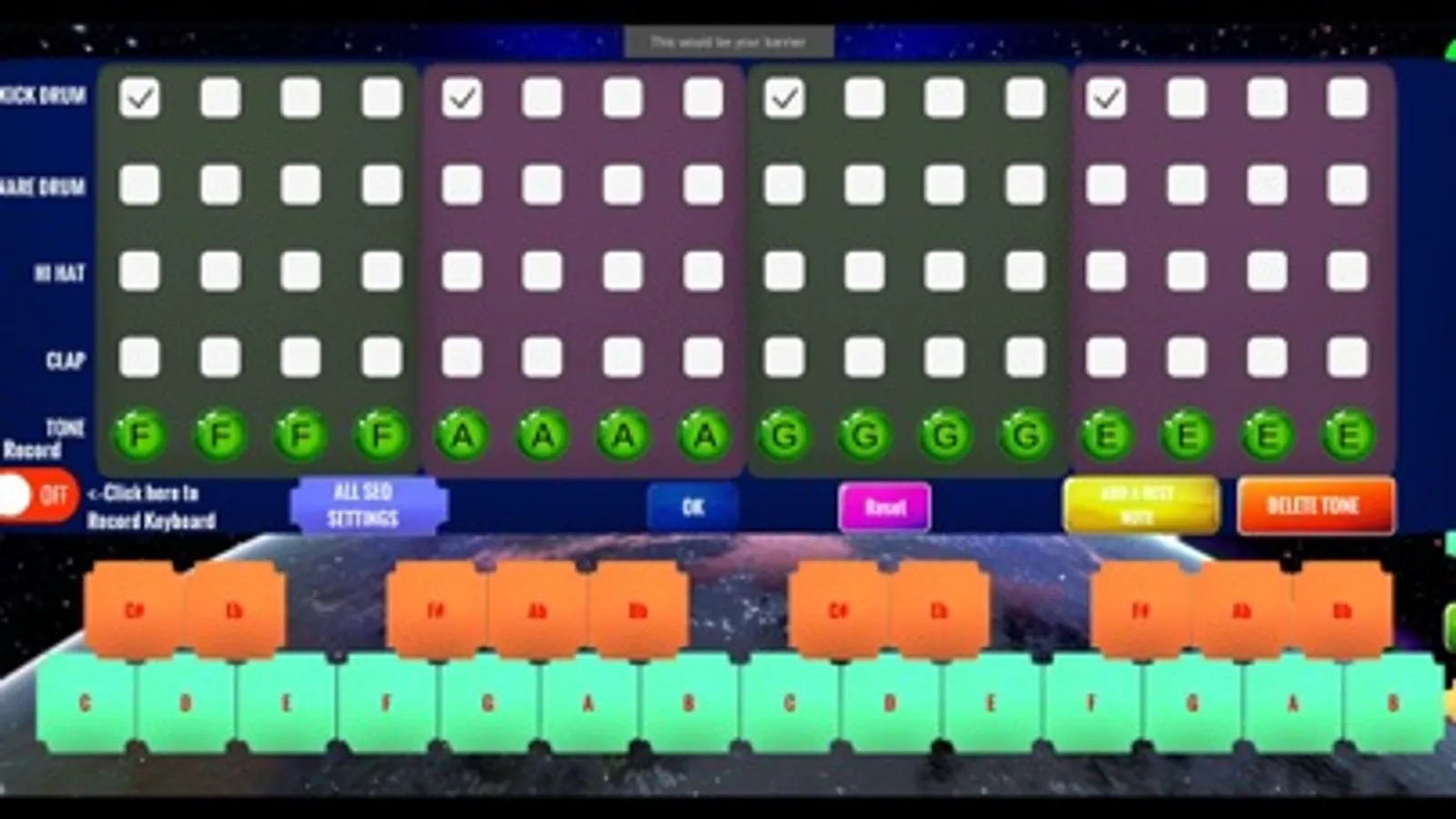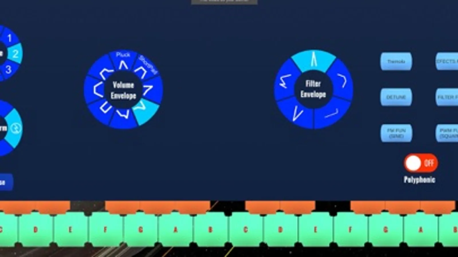 Space Synthesizer is an Analog Style Synthesizer that has stunning space graphics that beat to the music you're playing. All instruments are procedurally created, meaning no recordings or wave files are used, and we provided many buttons and sliders for you to modify the instruments. Instruments include flute, guitar, bass, strings, bells, synth pads.
