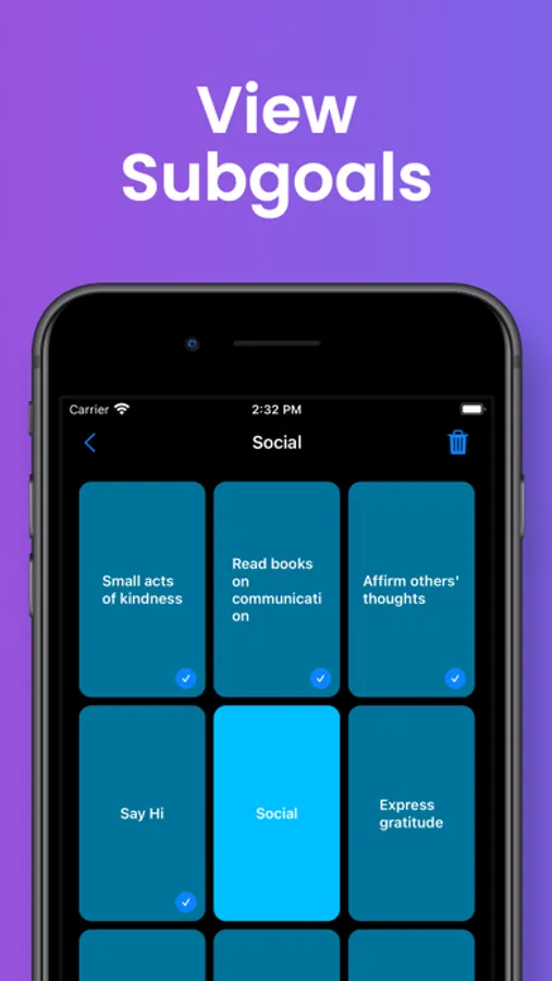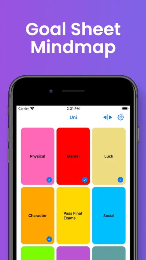 When you launch the app, you'll see a 3x3 grid with nine squares. Place your ultimate goal in the center square and set the elements required to achieve that goal in the surrounding squares. Then, specify the concrete actions necessary to accomplish each element in it's subchart. As you achieve the elements and goals, mark each square with a checkmark!