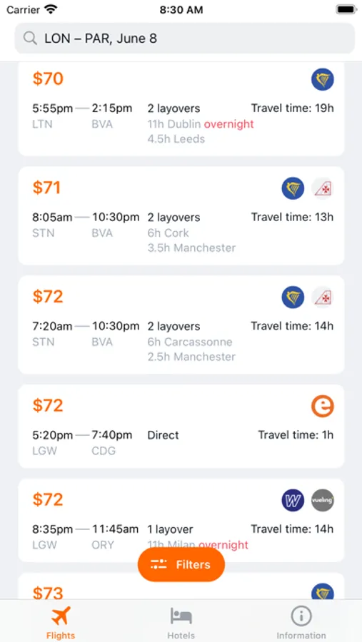 - See just the flights that fit your price range, airport, airlines, number of stops, take-off and landing times