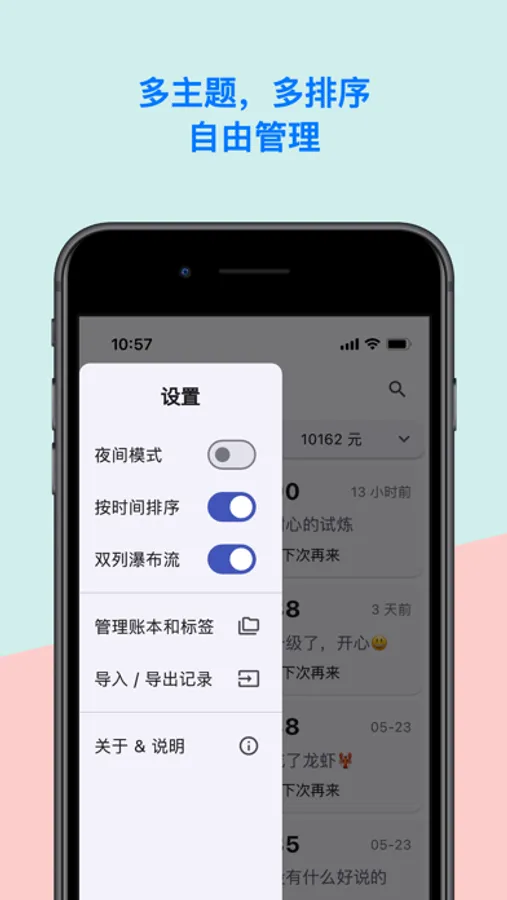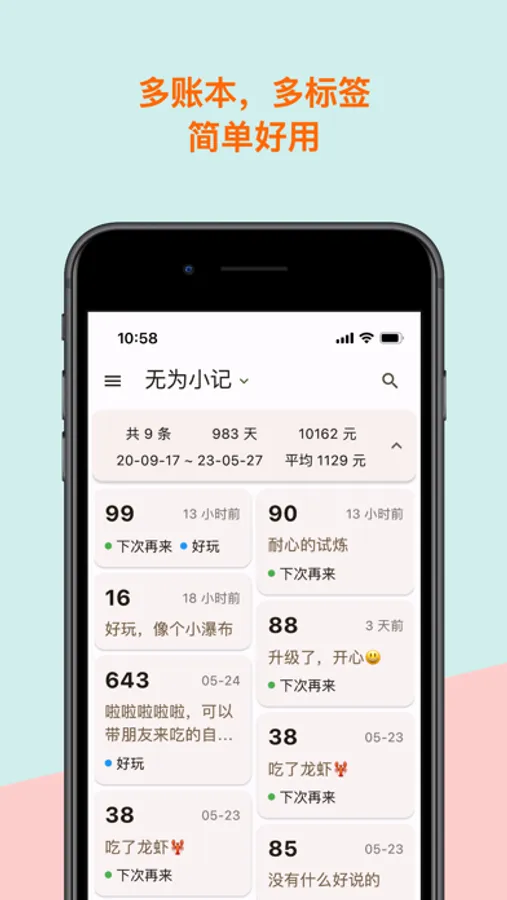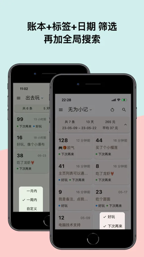 【查找方便】有多账本,多标签,时间范围筛选,备注搜索。数据再多,也能轻松定位。