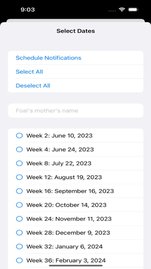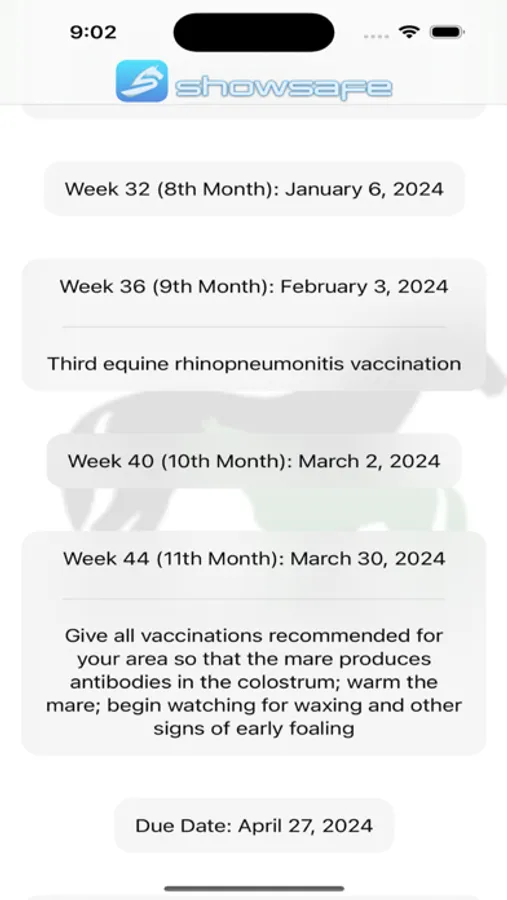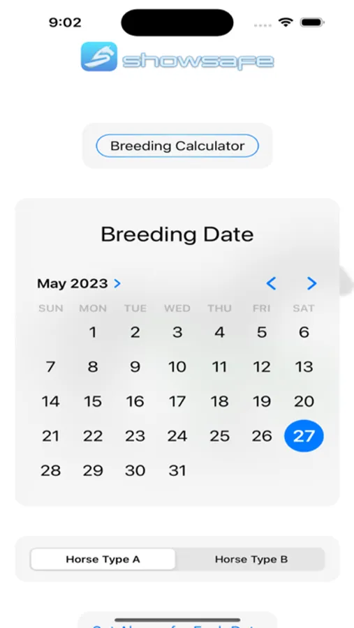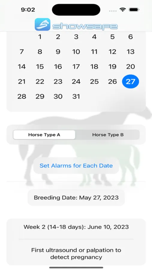 ShowSafe Breeding Calculator is an equine gestation calculator that uses calendar input and optionally schedules notifications based on the recommended events during a horse's pregnancy.
