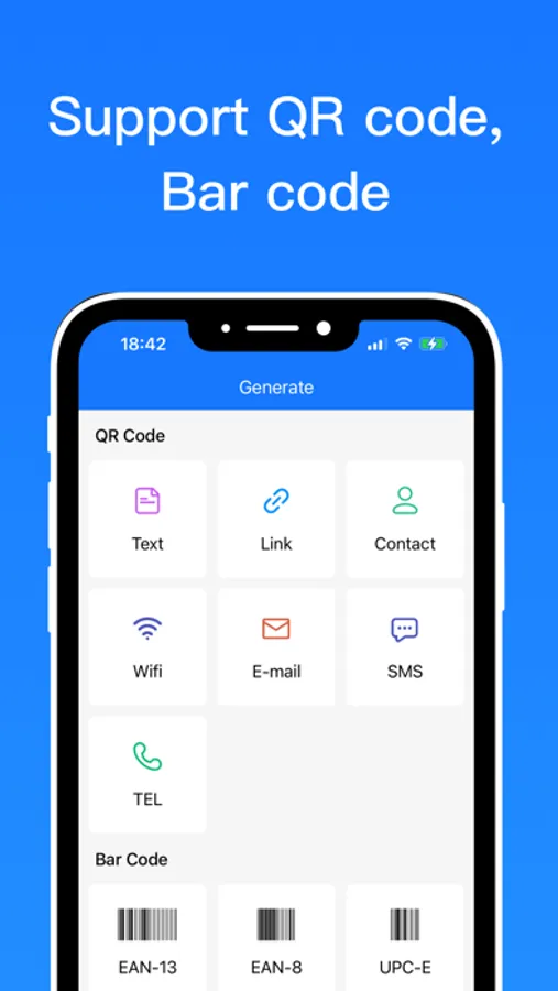 • Code types: AZTEC, CODE 128, CODE39MOD43, COD39, CODE93, QR CODE, DATAMATRIX, EAN13, EAN8, INTERLEAVED2OF5, ITF14, UPC, PDF417