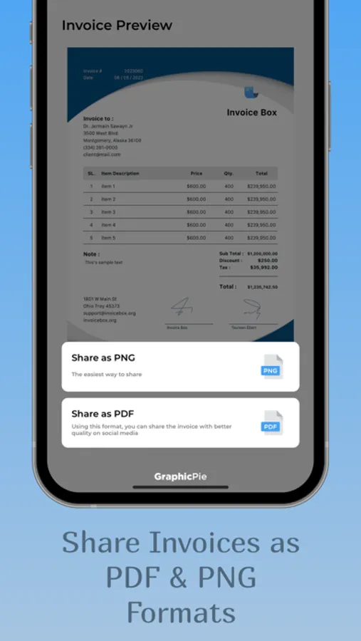 You can sign your invoices, as well as let your customers sign on your phone or tablet to accept an invoice, a quote or estimate. You can email, print or share any bill or estimate with other apps such as Facebook, WhatsApp or SMS. You have an invoice template with a professional design that can be sent as a PDF or PNG. SpeedInvoice makes your business look good and is simple to work with! You can profile your business with your logo and a flexible design to create a great looking business invoice.