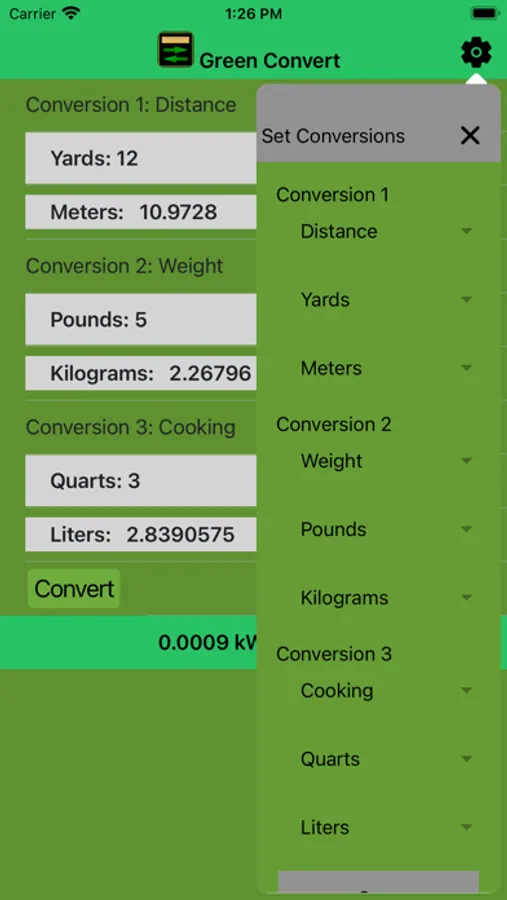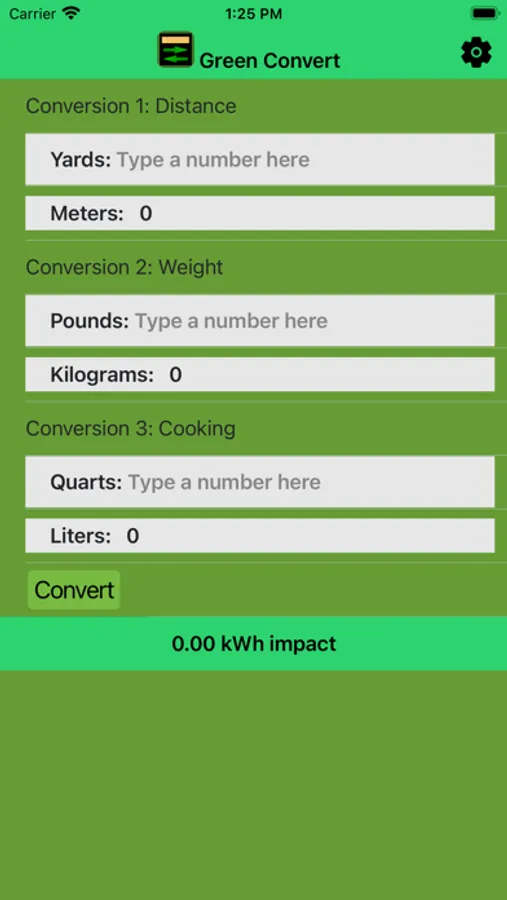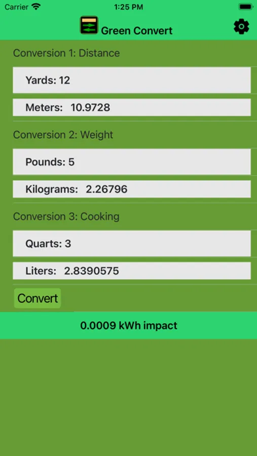 Green Convert is this application. You can configure three of your most frequently used conversions for common metrics including weights, distance, area, and cooking. For example, you can convert from yards to meters or acres to square feet. Green Convert includes an estimate of how much energy is saved by performing the conversions locally on your device. In addition, the application functions without internet access.