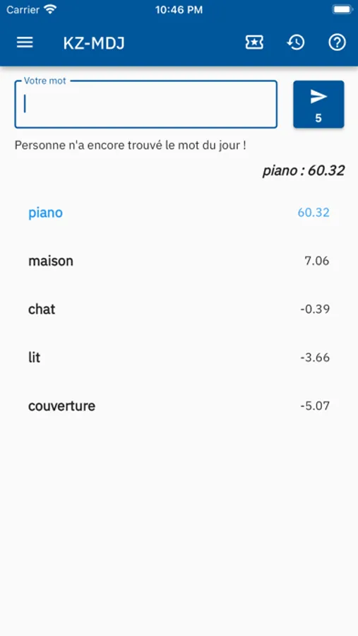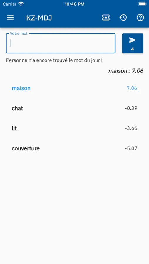 Le concept est simple : trouvez le mot secret du jour en devinant et en comparant vos propres mots. Entrez votre proposition dans le champ de texte et soyez récompensé par un score en fonction de la proximité contextuelle avec le mot secret. Affinez votre sens du langage et visez le score parfait de 100 pour chaque défi.