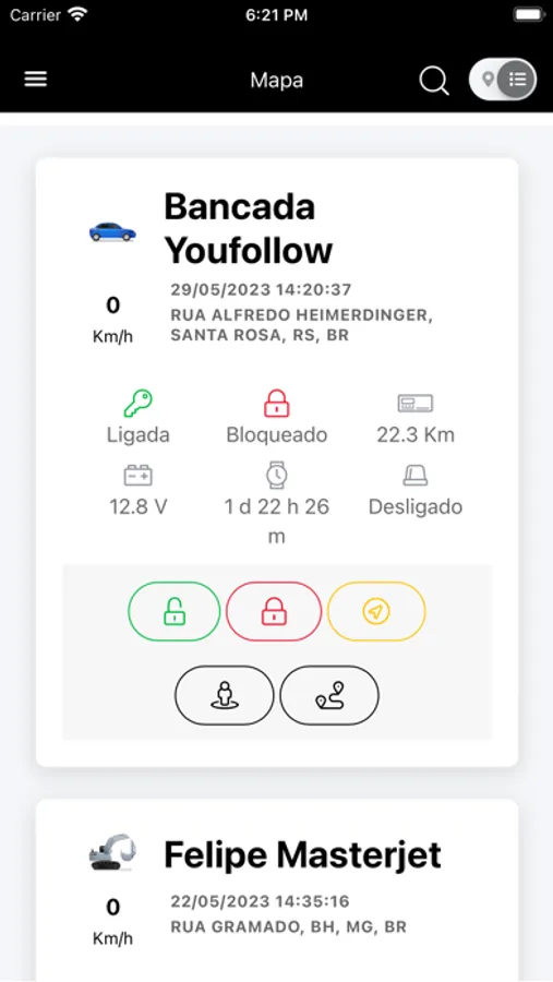 Com o aplicativo instalado no seu smartphone você poderá visualizar em tempo real a localização do seu veículo, além de poder executar ações como bloqueio e desbloqueio remoto do veículo.