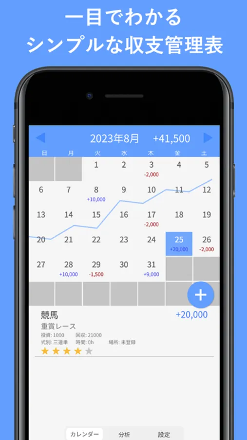 ・公営競技だけでなく、デイトレード、株、FX、パチンコ、パチスロなどの結果も記録できます。