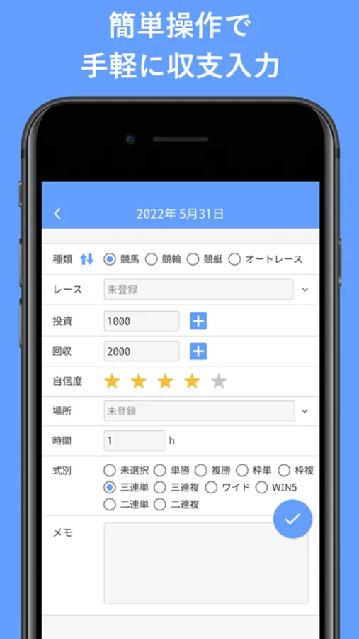 -公営競技4種をボタンで選択。任意の内容も入力して登録できます。