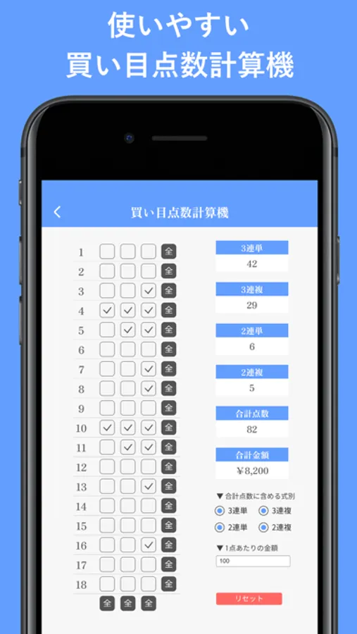 ・競馬場やボートレース場で利用できる買い目点数計算機も搭載しています。