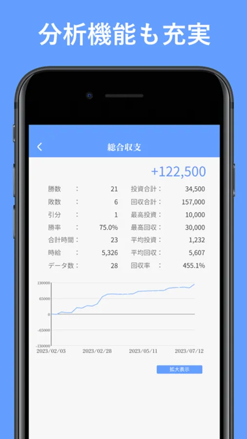 ・分析画面で16項目以上の詳細データや総合収支、年間収支などが確認できます。