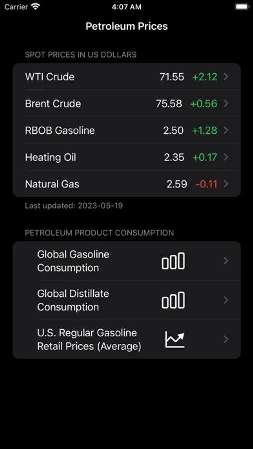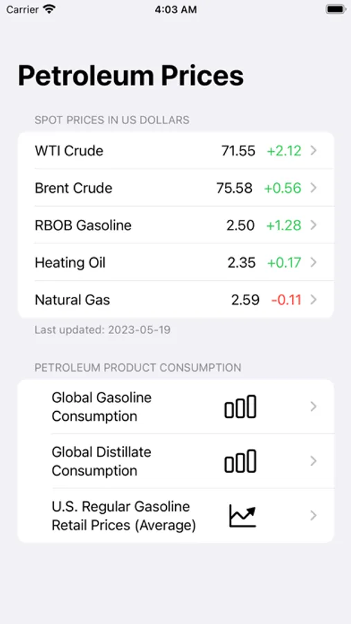 The current price of oil at your fingertips. View current and historical petroleum spot prices for leading energy products such as WTI Crude, Brent Crude, RBOB Gasoline, as well as current and historical trends for global petroleum product consumption and average U.S. gasoline prices.