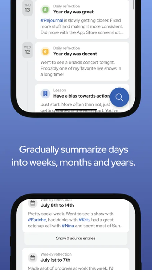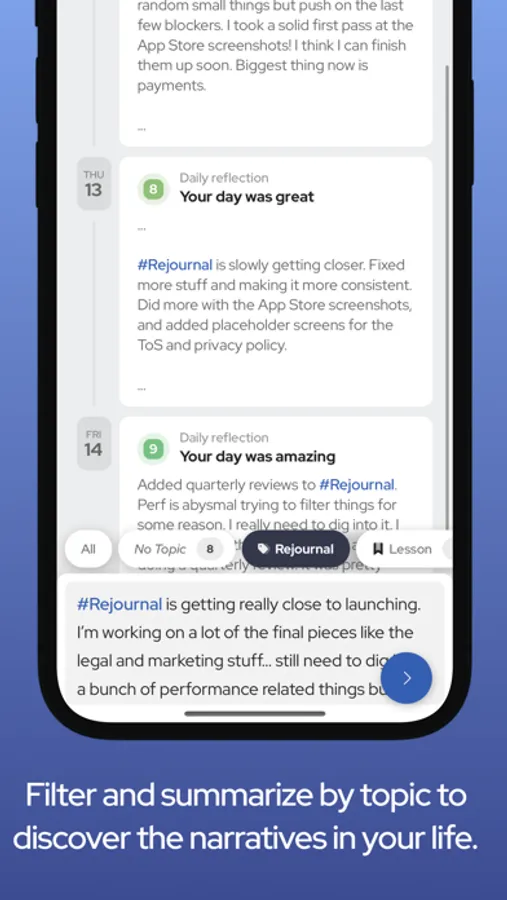 Rejournal goes beyond traditional journaling by empowering you to regularly revisit, collect, and process your thoughts. Every week, entries are filtered by topic, allowing you to write insightful summaries that reveal larger ideas. At the end of each month, you'll explore your weekly summaries to identify recurring patterns, rather than sifting through 30 daily entries. The same enlightening process happens at the end of each quarter and year, enabling you to uncover the narratives that shape your life. Reconnecting with your thoughts helps you pay closer attention and recognize the underlying patterns that govern your life.
