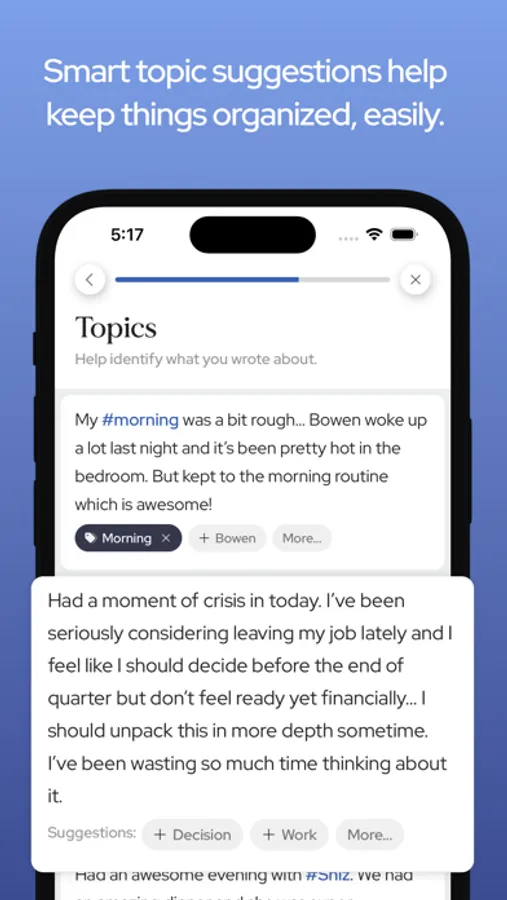 Say goodbye to the hassle of manually tagging your entries! With Rejournal, you can effortlessly track your thoughts and experiences using multiple keywords for each topic. Our intelligent system suggests relevant topics, making journaling a seamless and enjoyable experience.