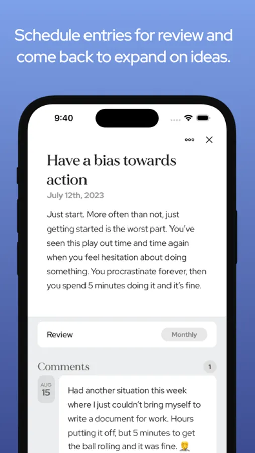 Rejournal offers a wide array of templates to help you explore and unravel more profound ideas. Whether you're dealing with fears, decisions, life lessons, or simply need a blank canvas, our diverse entry types cater to your unique needs. You can schedule entries for regular reviews where you can add comments to expand on your initial thoughts. Engage in an ongoing dialogue with yourself as you unpack ideas and explore how expectations align with reality.