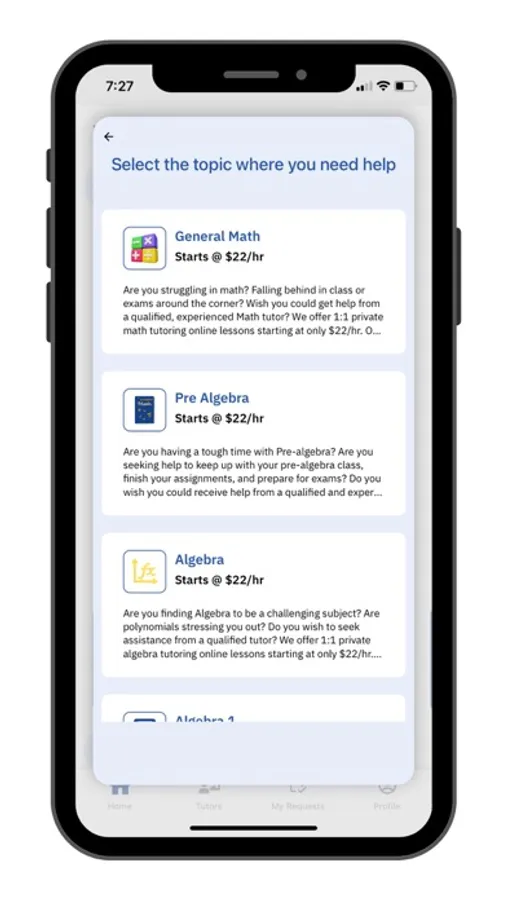 Step 1: Select the subject/area where you need help. Give us details of your learning need. The more you share the faster we can find the right tutor for you.