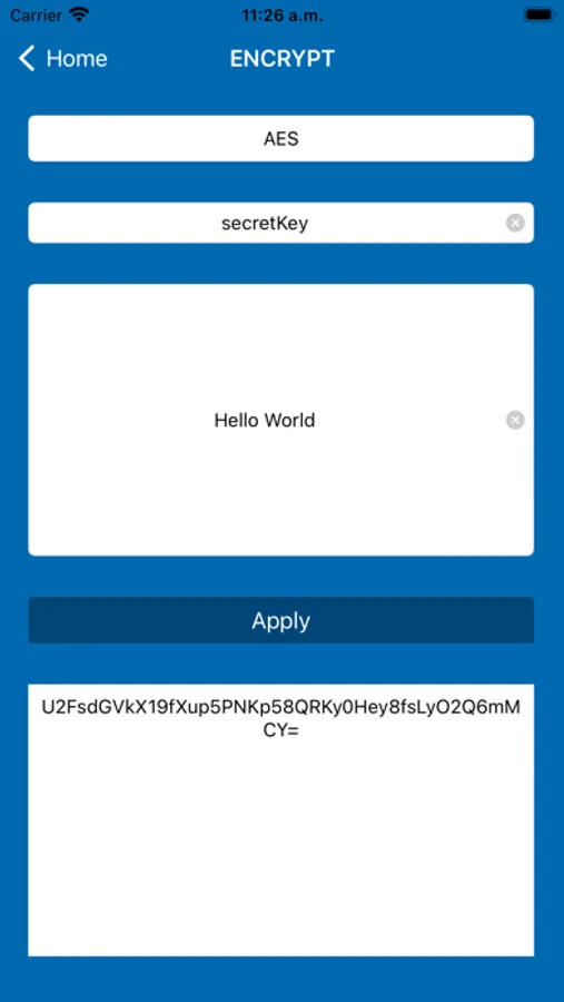 Una vez que los datos son ingresados, la aplicación realiza una llamada a la API correspondiente para realizar la encriptación. La respuesta de la API se muestra en pantalla, mostrando el resultado de la encriptación.