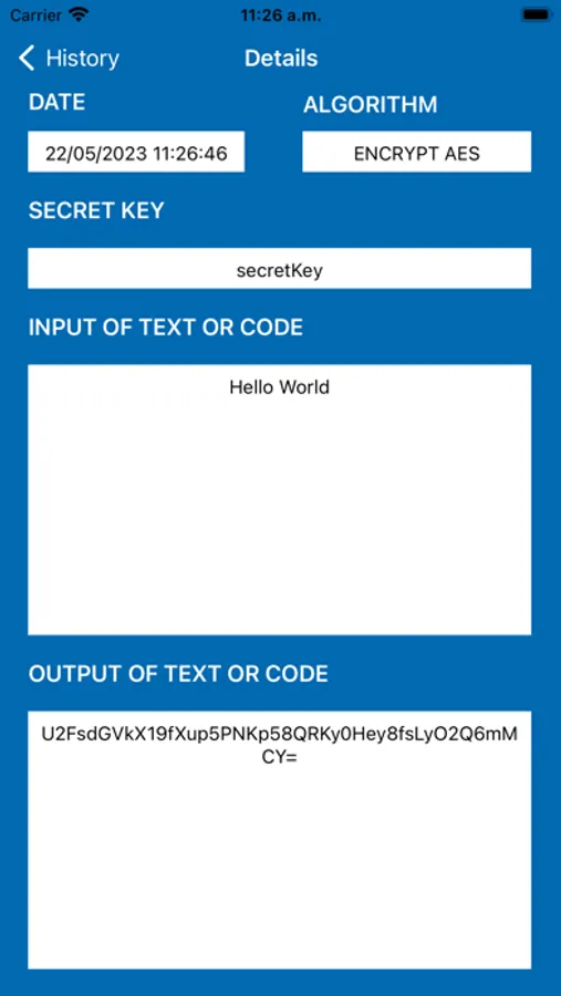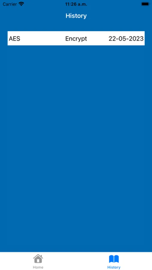 Además de la funcionalidad principal, la aplicación también ofrece un historial de uso de las APIs. Cada vez que se realiza una encriptación o desencriptación, se guarda un registro en el historial que muestra la fecha y hora de la operación, el algoritmo utilizado y los datos de entrada y salida.