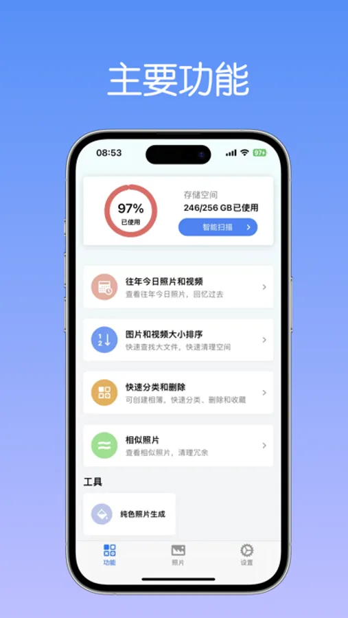 照片管理大师,一个专业整理照片和视频及相关实用工具的App,主要功能如下
