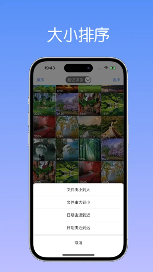 2.照片和视频可以按照文件大小排序,快速找出大文件,有些视频可能很大,忘了删了,但是一下子又不知道是哪一个;