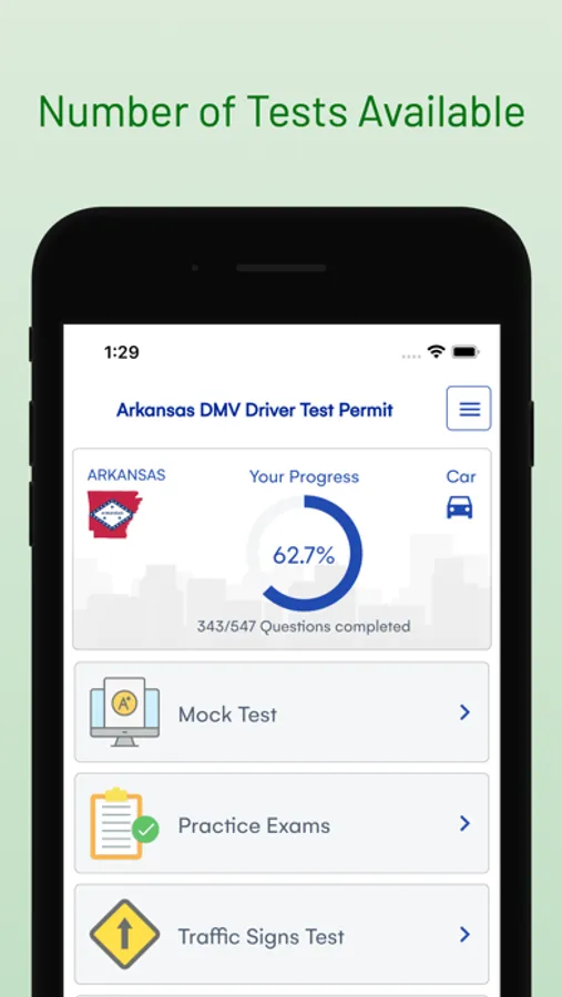 Our Arkansas AR Driver Test Permit app , is easy to use and accessible from anywhere, on any device. You can practice on your phone, tablet, at home or on the go. And with our free and unlimited tests, you can practice as many times as you need to feel comfortable and confident for the real DMV Written test .