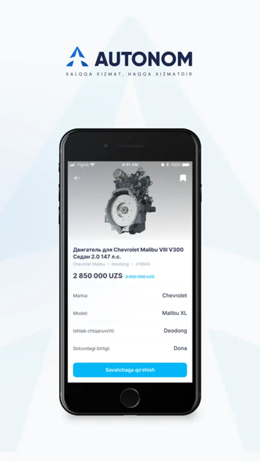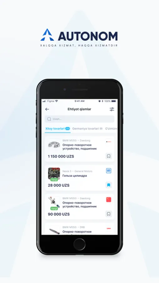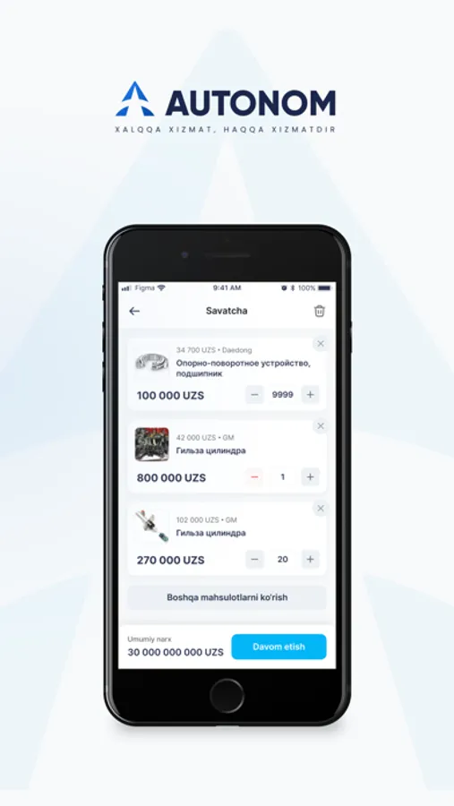 Автомобиль ишқибозлари ва юқори сифатли автомобиль жиҳозларни қидираётган мутахассислар учун энг яхши онлайн-дўкон Аутономга хуш келибсиз. Аутоном ёрдамида сиз автомобилларга техник хизмат кўрсатиш ва таъмирлаш ишларини ҳар қачонгидан ҳам осонлаштириб, автомобиль маҳсулотларининг кенг тўпламини харид қилишингиз мумкин. Автомобиль ишқибозлари ва профессионал механикларнинг эҳтиёжларини қондириш учун синчковлик билан танланган автомобиль асбоблари, жиҳозлари ва аксессуарларининг кенг танловини кашф этинг. Бизнинг қулай интерфейсимизни кўриб чиқинг, у эрда сиз турли бўлимлар бўйлаб осонгина ҳаракат қилишингиз ва керакли воситаларни топишингиз мумкин. Энг зўр автомобиль воситасини топганингизда, уни саватга қўшинг ва уни расмийлашитиришга ўтинг. Буюртмангиз тасдиқлангандан сўнг, бизнинг махсус жамоамиз уни тезда қайта ишлайди ва сиз танлаган манзилга тезкор етказиб беришни таъминлайди. Автоном иловасини бугун юклаб олинг ва автомобиль имкониятлари дунёсини очинг. Барча автомобиль эҳтиёжларингиз учун ишончли онлайн манзилингиз бўлган Аутоном иловаси билан автомобилингизга техник хизмат кўрсатиш ва таъмирлаш ишларини яхшилаш имкониятига эга бўлинг.