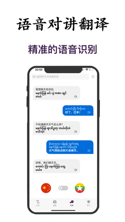 缅甸语翻译是为小伙伴们专门学习缅甸语以及去缅甸旅行而开发的一款专业、简洁、好用的缅甸语翻译App,拥有地道的方言发音、精准的语音识别、准确ocr图文识别能够更好的去帮助喜欢缅甸旅行的用户与当地朋友无障碍畅享交流,缅甸语翻译app也很好的在学习、旅行等方面帮助到用户,是一款实用的中缅翻译助手。