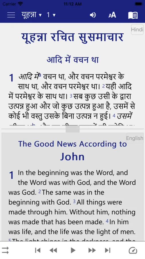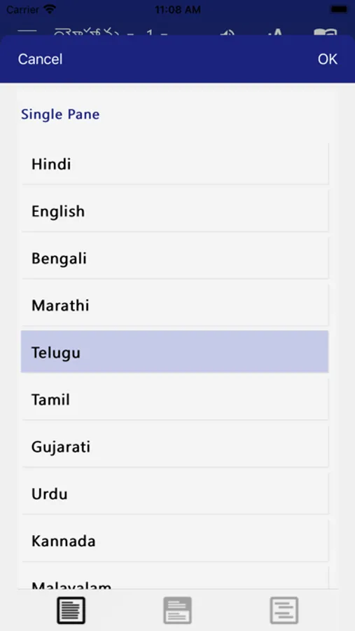 • Split screen: If you want two languages in parallel on your screen, you click on the book icon and then you tap on ‘split screen’ in the middle of the new window, then you choose the two languages you want to display on your screen . For example: Hindi at the top and English at the bottom etc.