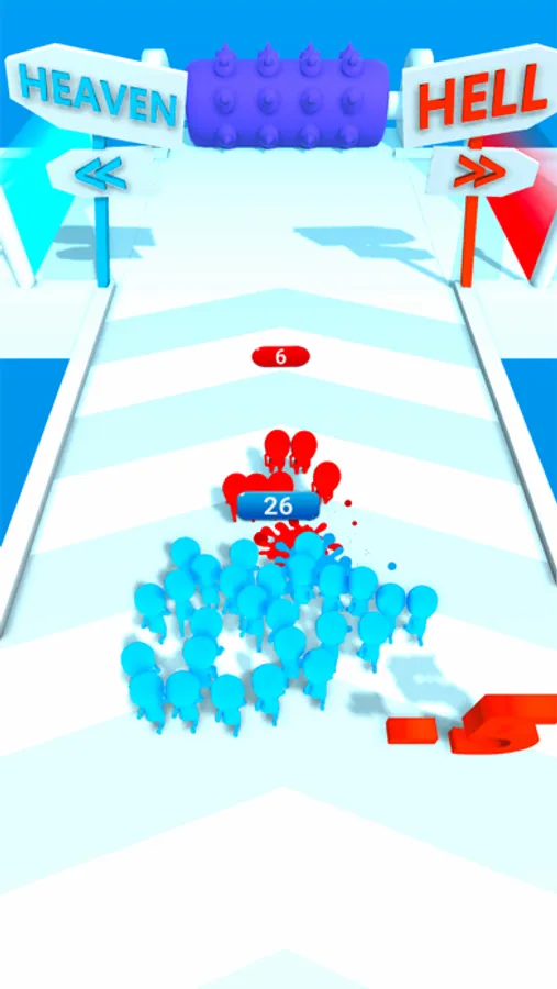 Race to the finish line, choosing between hell or heaven at the crossroads, overcoming obstacles and hundreds of enemies along the way. Collect the blue numbers and avoid the red ones to keep growing your army. Collect power-ups along the way that will help you easily defeat your enemies. Complete increasingly difficult levels to finally open a treasure chest full of riches! Which path will you choose?