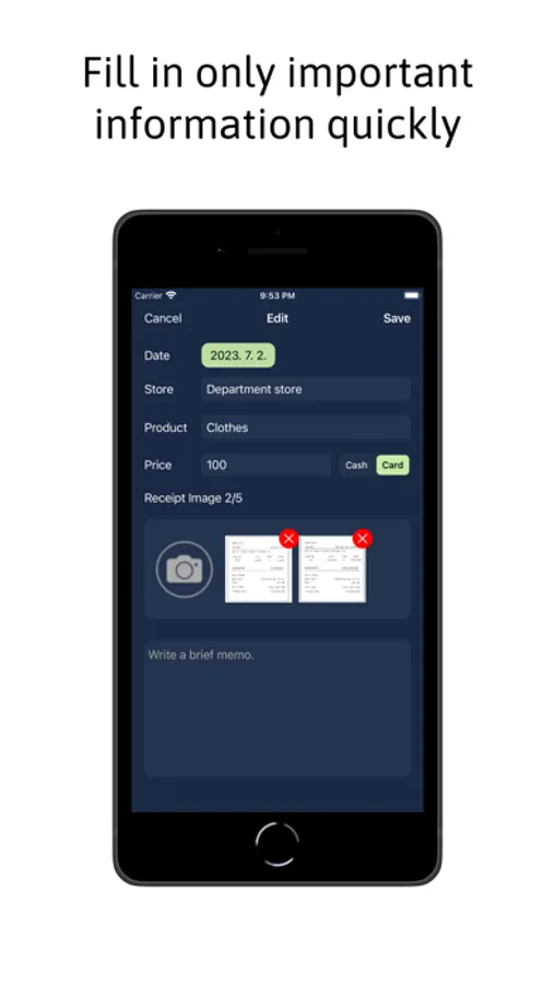 - Easily manage your receipts by simply adding your business name, description, price and photo!