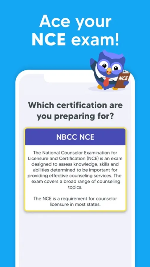 Pass your NCE exam with ease. Take realistic practice quizzes and exams to boost your chances of passing the real exam on your first try. With 1000+ questions written by experts, detailed explanations for each question, and hundreds of tests & quizzes at your fingertips, this is the only resource you need to prepare for the NBCC NCE Exam.