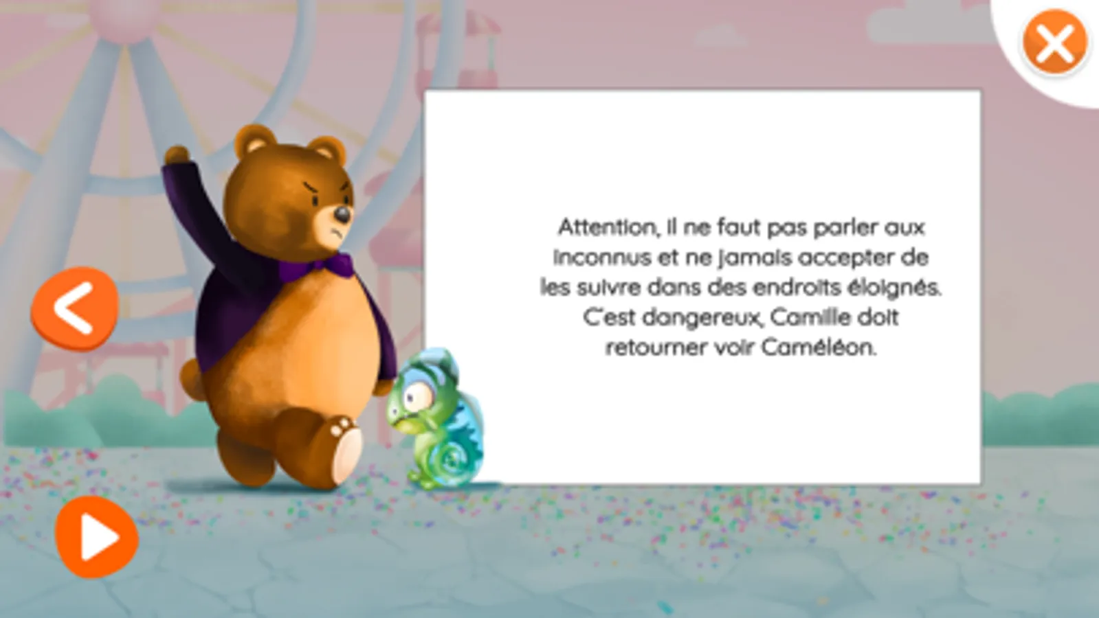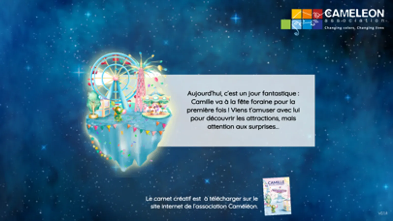 Camille à la fête foraine est un outil développé par CAMELEON Association France où les enfants suivent l’aventure d’un petit caméléon. Dans la vraie vie comme sur Internet, il y a parfois de bonnes et de mauvaises surprises. Camille devra faire attention à ne pas tomber dans les pièges ! Aidez-le à faire les bons choix.