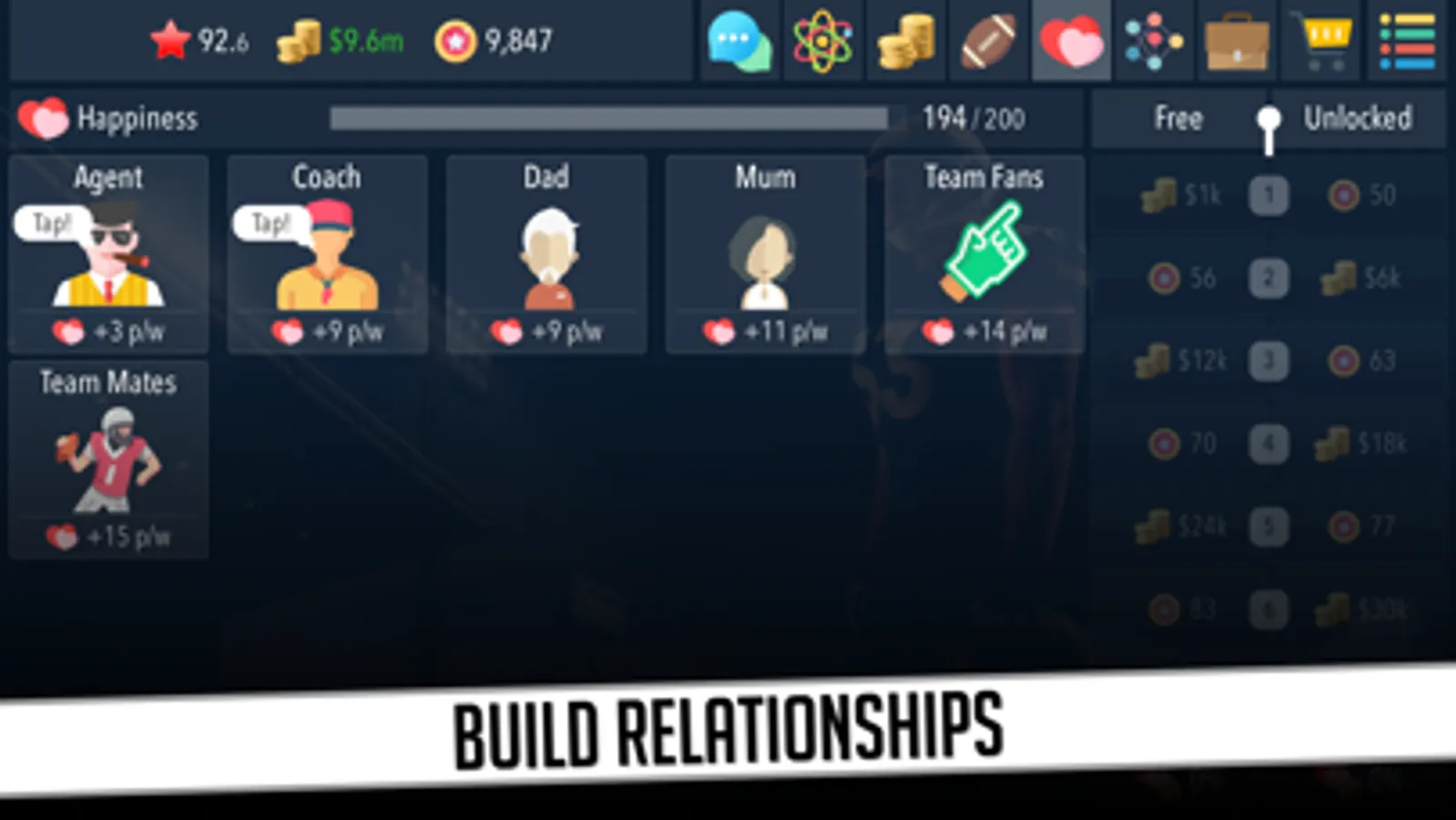 Manage relationships throughout your career. Build a rapport with your teammates, fans and coach. Look after your parents, perhaps get married and even have a kid!