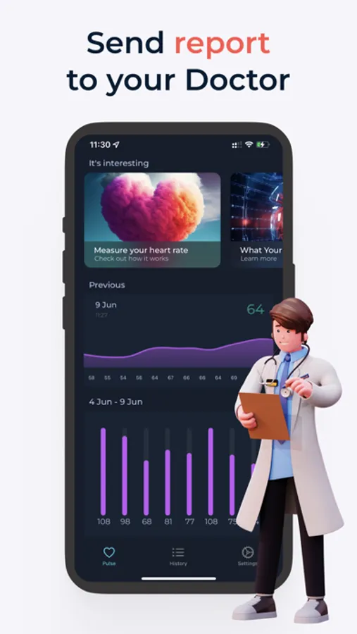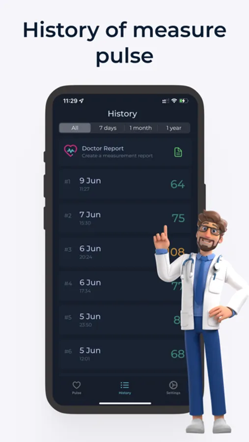 5. Historical Data: Keep track of your pulse history with Pulsy. View your past measurements, compare trends, and identify changes over time to better understand your cardiovascular well-being.