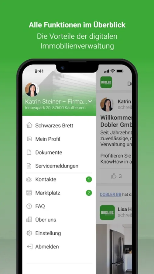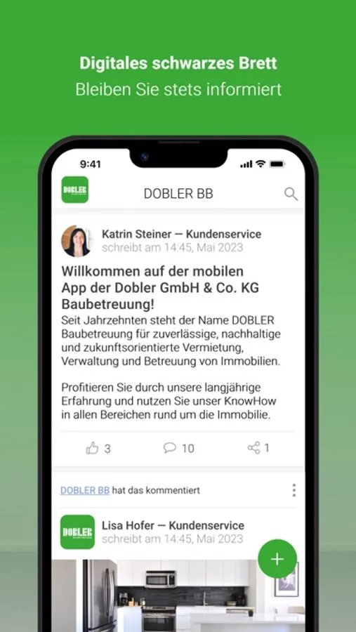 Als Kunde der Dobler GmbH & Co. KG Baubetreuung profitieren Sie von einem besonders innovativen Kundenservice, der Ihnen viele Freiheiten bietet. Mit der DOBLER BB App können Sie uns rund um die Uhr Anliegen und Schäden inklusive Fotodokumentation per Smartphone melden. Zusätzlich stellen wir Ihnen eine digitale Dokumentenmappe mit wichtigen Dokumenten für Ihre Immobilie(n) zur Verfügung. Über das digitale schwarze Brett informieren wir via Push-Nachricht proaktiv über wichtige Informationen rund um die uns anvertrauten Immobilien.