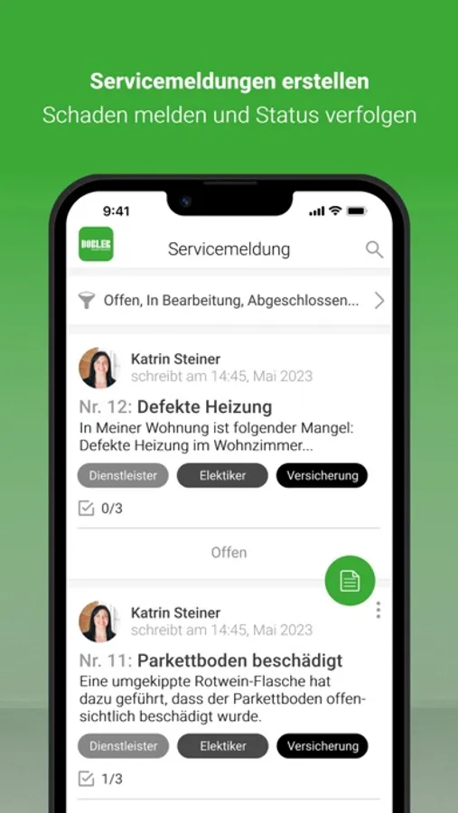 - Interaktiv: Sie können in der DOBLER BB App direkt Schadensmeldungen oder andere Anliegen mit Fotos erfassen. Ihr Sachverhalt wird schnell bearbeitet und Sie erhalten regelmäßige Status-Updates per Push-Nachrichten.