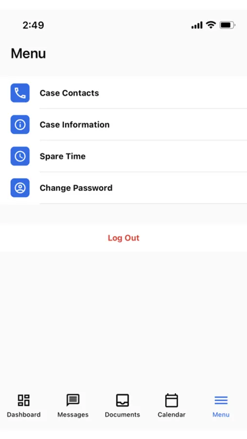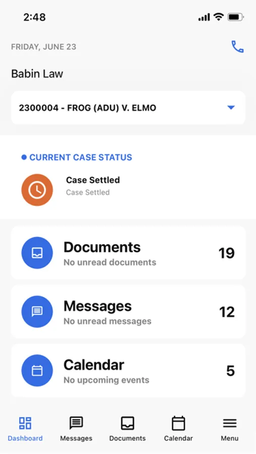 Navigating the Babin Law's Client Portal app is a breeze, with its user-friendly design featuring five main sections - Dashboard, Messages, Documents, Calendar, and Menu - all conveniently located on the bottom footer for quick access.