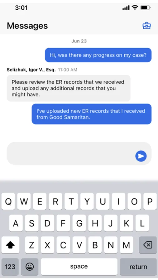 The Message feature allows you to communicate with the attorney and team working on your case directly through the app, ensuring that no message is missed.