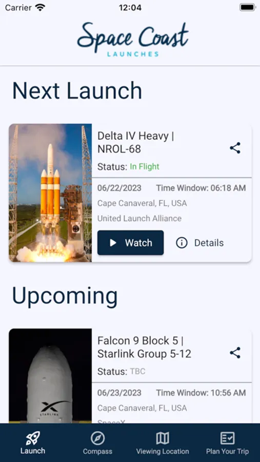 Track the rocket launch schedule on Florida’s Space Coast with Space Coast Launches. This app contains the schedule of rocket launches from the Kennedy Space Center and Cape Canaveral Space Force base from organizations like NASA, SpaceX, ULA and more with a clean and convenient user experience. Receive T-24 hour and T-5 minute launch notifications, live launch feeds, a map of popular viewing locations and rocket experiences on Florida’s Space Coast, and much more.